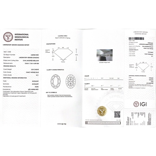 สีของเพชรเหล่านี้เกิดจากการมีอะตอมของโบรอน ซึ่งทำให้มีสีฟ้าโดดเด่น ลักษณะเฉพาะนี้ทำให้พวกเขาเป็นที่ต้องการอย่างมากสำหรับแหวนหมั้น ของขวัญวันครบรอบ และโอกาสพิเศษอื่นๆ ด้วยสีที่สดใสและความชัดเจนที่โดดเด่น ห้องแล็บที่สร้างแหวนเพชรสีน้ำเงินจึงสามารถเป็นศูนย์กลางที่สมบูรณ์แบบสำหรับคอลเลกชั่นเครื่องประดับ