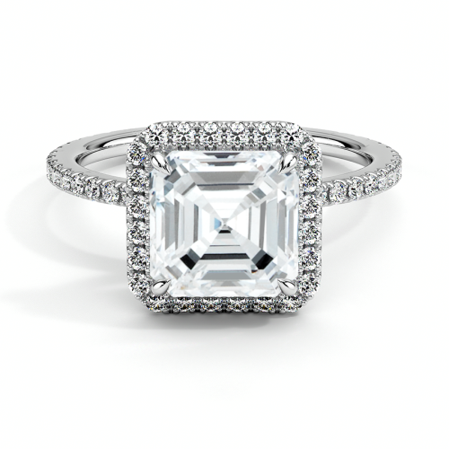 - เพชรแอสเชอร์คัทอันน่าทึ่ง ล้อมรอบด้วยรัศมีเพชรเม็ดเล็กเพื่อเพิ่มความแวววาว