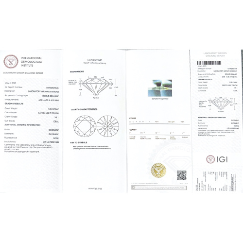 สีเหลืองเพชรในห้องปฏิบัติการ แต่ละชิ้นผสมผสานความงามของโทนสีเหลืองคานารีเข้ากับการรับประกันทางจริยธรรมของ การรับรอง IGI สร้างความสง่างามเหนือกาลเวลาโดยไม่มีการประนีประนอม